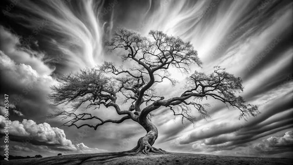 A Surreal Black and White Landscape Twisted Branches Reaching for an Ethereal Sky Capturing the Beauty of a #1394125347