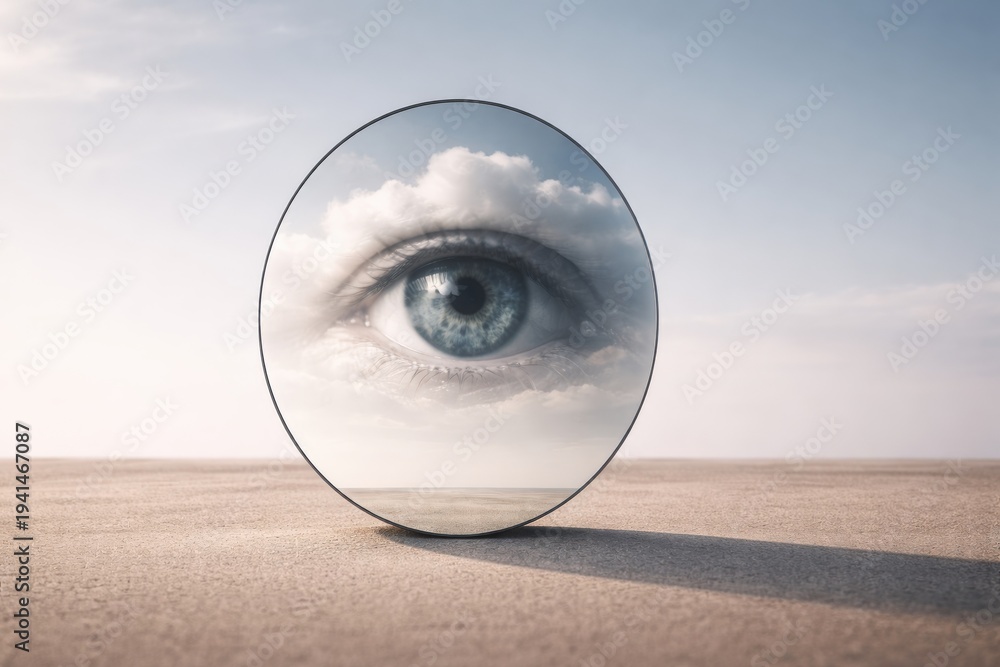 A surreal image of a magnifying glass reflecting a blue eye with clouds in the background on a sandy terrain #1941467087