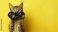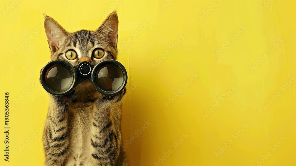A tabby cat holds binoculars in front of a bright yellow background. The cat has distinctive stripes and large, curious eyes. #1905363846