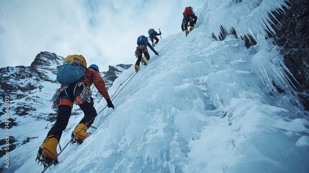 A team of climbers ascending an icy slope, using ropes and crampons #1492846805