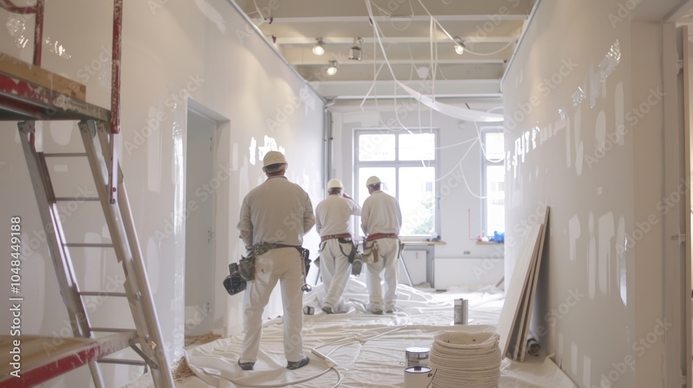 A team of painters carefully priming the walls of a newly renovated office space. #1048449188