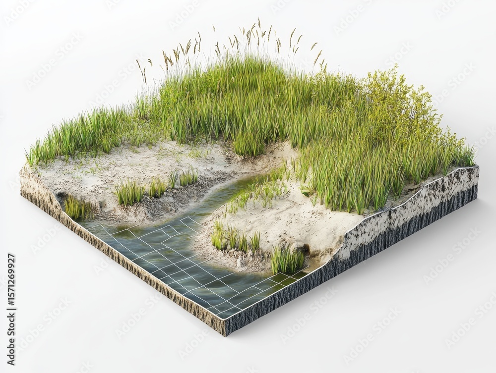 A technical diagram of salt marsh restoration technology showing tidal regulators, sediment deposition nets, zonal arrangement of plants, and protection from coastal erosion #1571269927
