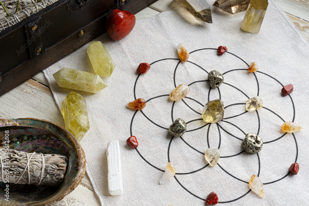 A top view image of a crystal grid for abundance which uses citrine crystals and sacred geometry grid cloth. #1945612808