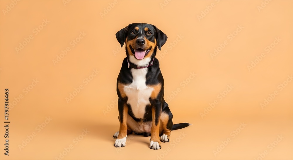 A tri colored dog sitting and looking forward with its tongue out on a plain orange background #1797914463