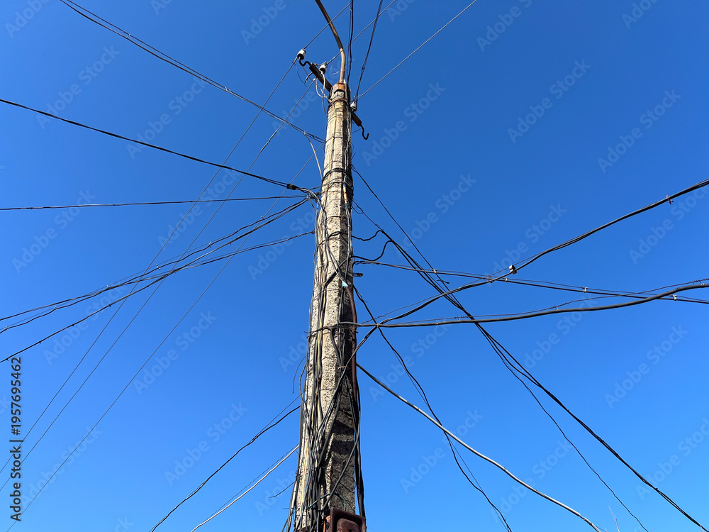 A utility pole stands in a city with many wires extending in different directions. The sky is blue with no clouds #1957695462