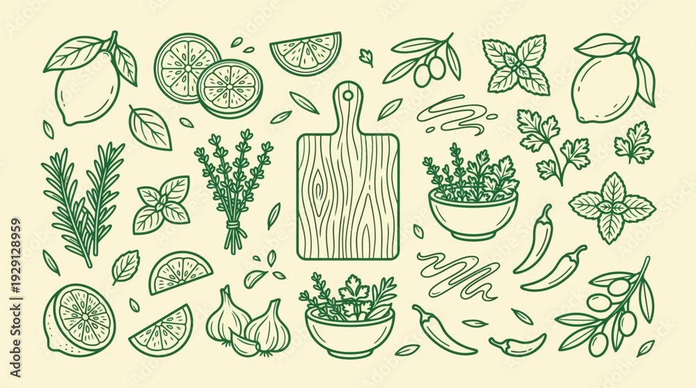 A vibrant collection of fresh herbs, citrus fruits, garlic, chili peppers, and olives arranged around a wooden cutting board, illustrating culinary ingredients and healthy eating. #1929128959
