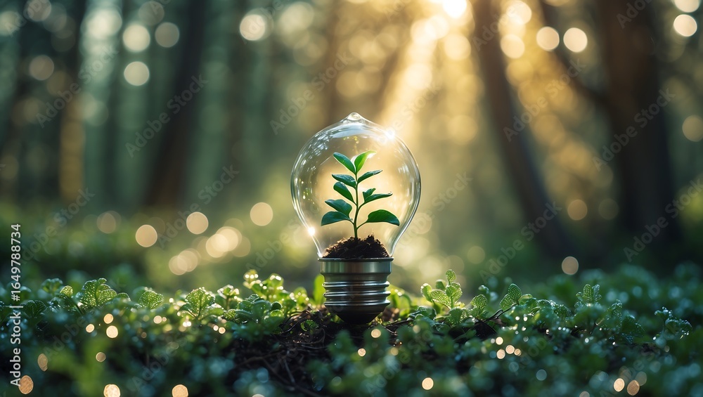 A vibrant green sprout thrives inside a glowing light bulb nestled in a lush, sun-dappled forest, symbolizing innovative sustainable energy and ecological hope for a brighter future #1649788734