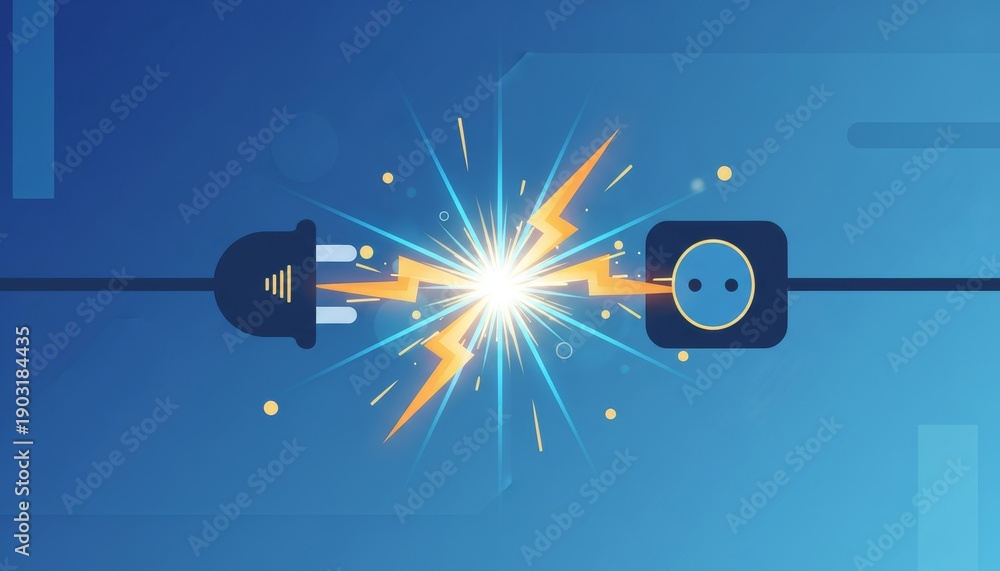A vibrant illustration showing an electric plug and socket connected by a wire, with a burst of energy depicted between them. #1903184435