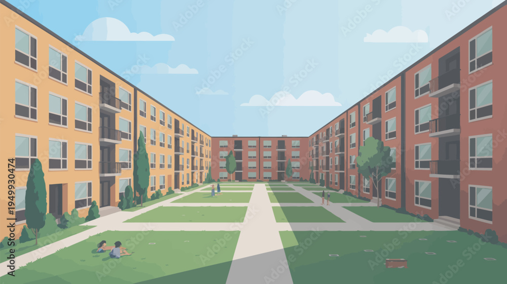 A vibrant university campus with modern apartment buildings and a green courtyard #1949930474
