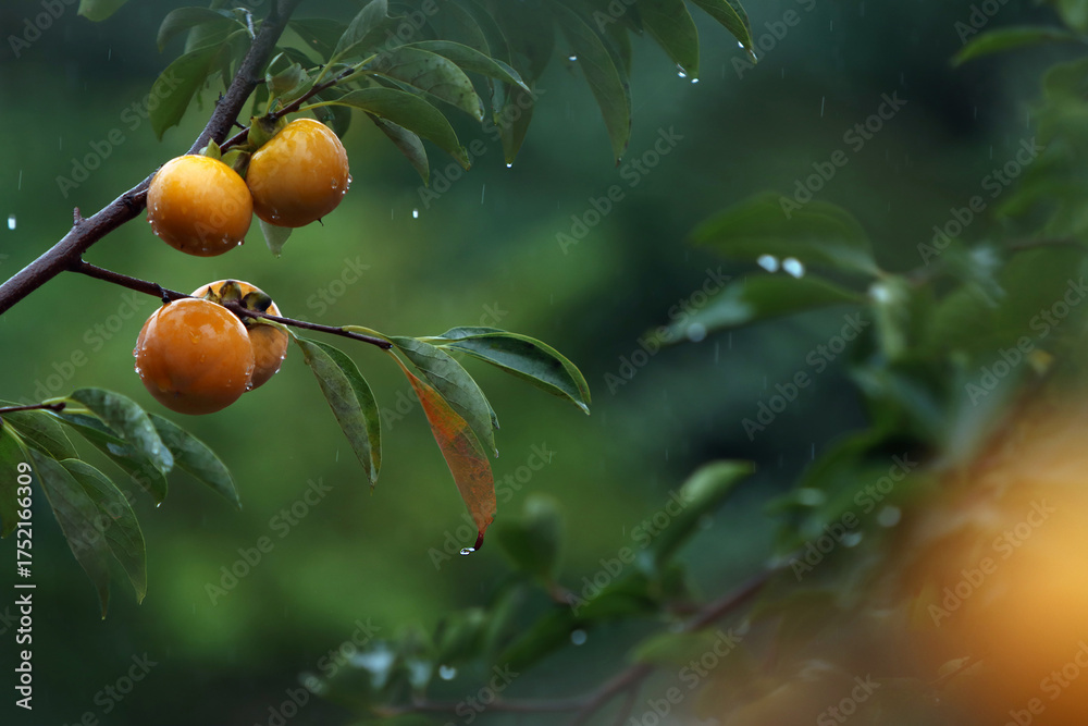 A view of an orchard in the rain, with ripe persimmons hanging in clusters from a rich autumn persimmon tree and delicious yellow persimmons. #1752166309