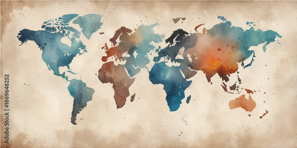 A vintage grunge world map illustration featuring global continents from America to Asia and Europe as a textured vector background for travel and geography design #1869648252