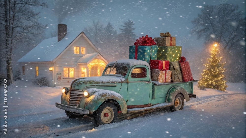 A vintage truck loaded with Christmas presents drives through a snowy winter night, bringing the joy of the season to a charmingly lit house and a sparkling Christmas tree. #1136623232