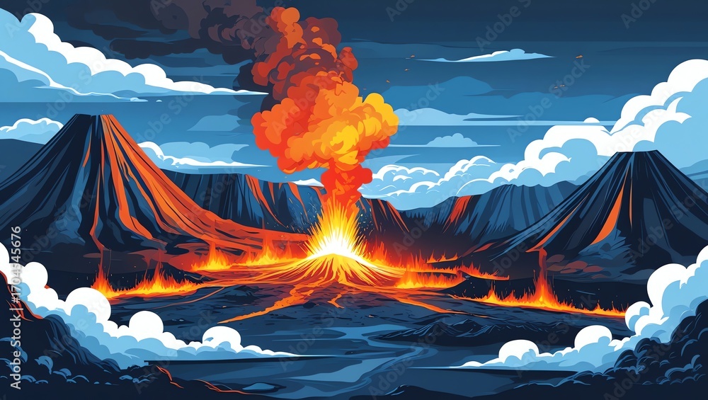 A volcanic eruption spews a massive plume of orange and yellow fire and smoke into a blue sky with clouds #1704545676