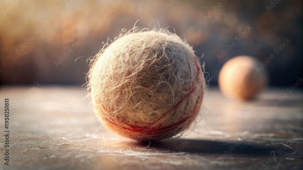 A well-worn, fuzzy ball rests on a textured surface, illuminated by soft light, with a slightly out-of-focus companion ball in the background, suggesting a sense of time and play #1950251811
