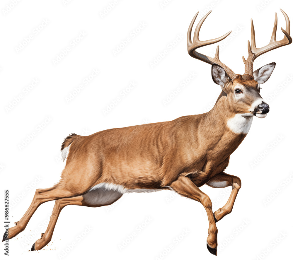 a white-tailed deer buck (Odocoileus virginianus) with antlers in motion, full body, side 3/4 view in a PNG, Nature-themed, isolated, and transparent photorealistic illustration. Generative ai #986627555