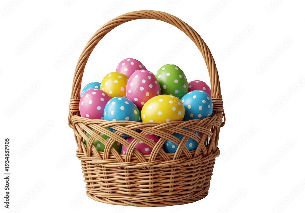 A wicker basket filled with colorful easter eggs and a few flowers isolated on transparent background #1934537905