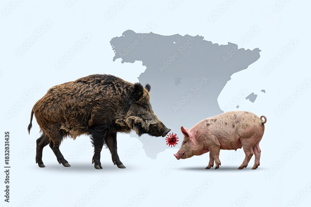 A wild boar and a pig catching swine fever, isolated, in a simple, minimalist background. #1832831435