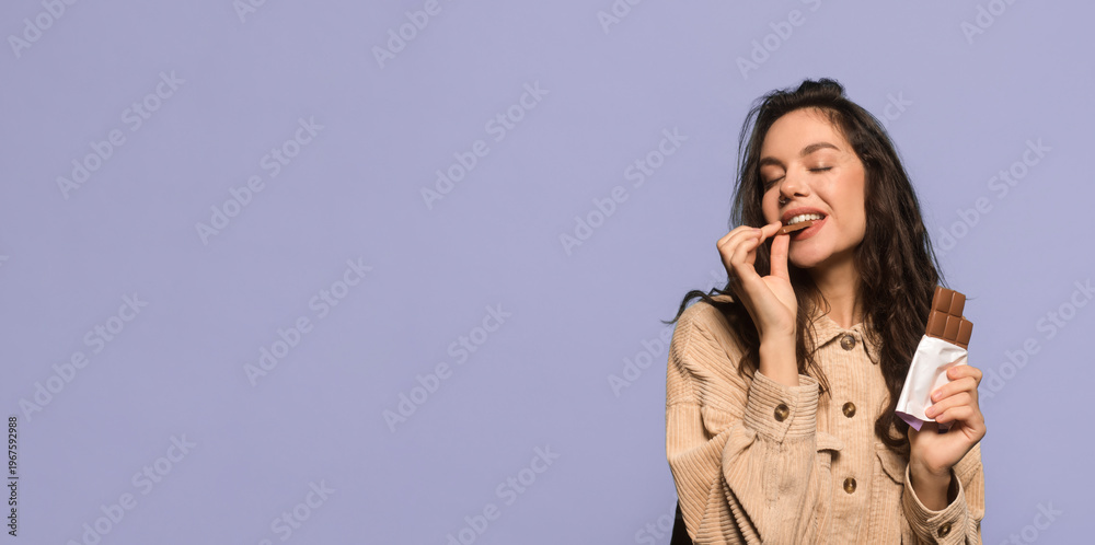 A woman holds a chocolate bar in one hand and takes a bite from it. She has long hair and is wearing a simple top. The background is a light purple color. #1967592988