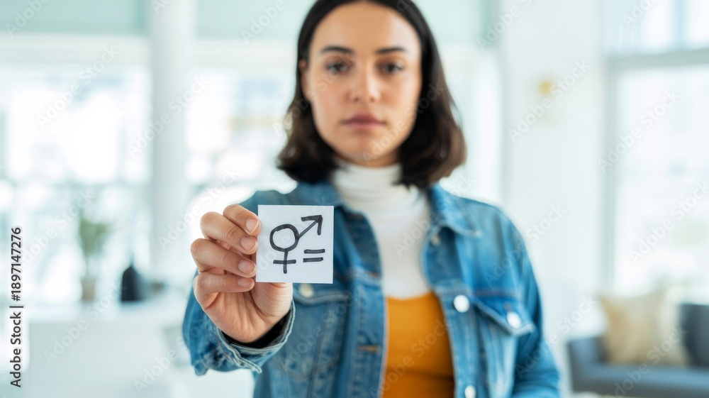 A woman holds a sign depicting gender equality symbols, emphasizing the importance of equal rights and representation in society. #1897147276