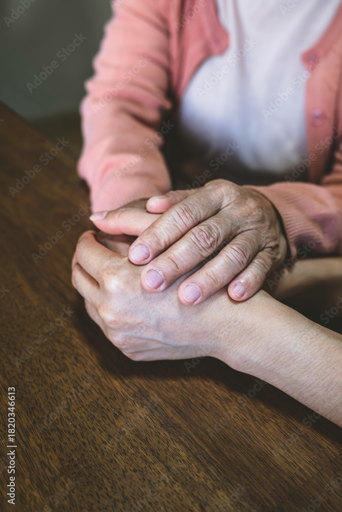A woman holds hands and gives love to her elderly mother at home, creating bonding and happiness. love and care concept #1820346613