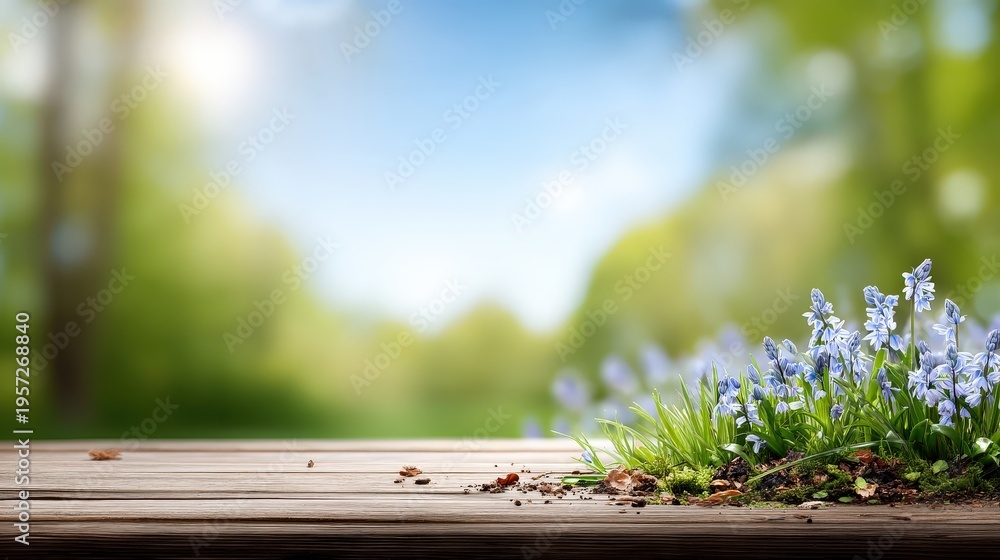 A wooden table in a spring scene with bluebells in grass against a blurred green background offers space for product showcase #1957268840