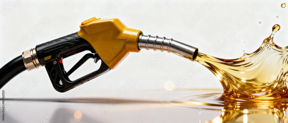 A yellow fuel pump nozzle dispensing gasoline with a splash effect on a reflective surface. #1840621150