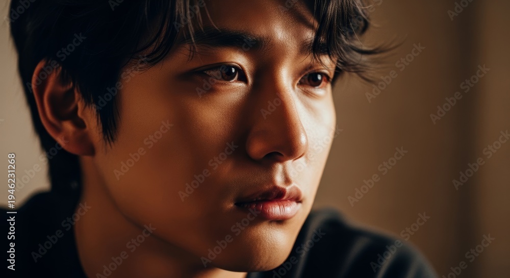 A young Asian man captured in a moment of profound contemplation, his gaze filled with introspection and a gentle sense of solemnity, evoking quiet reflection and emotional depth #1946231268