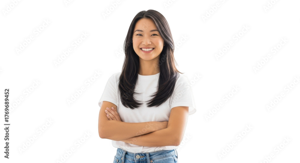 • #1769689452 A young asian woman with long dark hair smiles confidently with her arms crossed standing isolated on transparent background