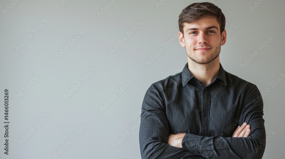 A young man in a black shirt standing against a gray background with his arms crossed. #1466013269