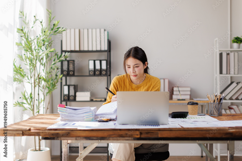 A young woman in an orange sweater is concentrated on her work at a desk while organizing files and papers, creating a productive environment for her tasks. #1949605750