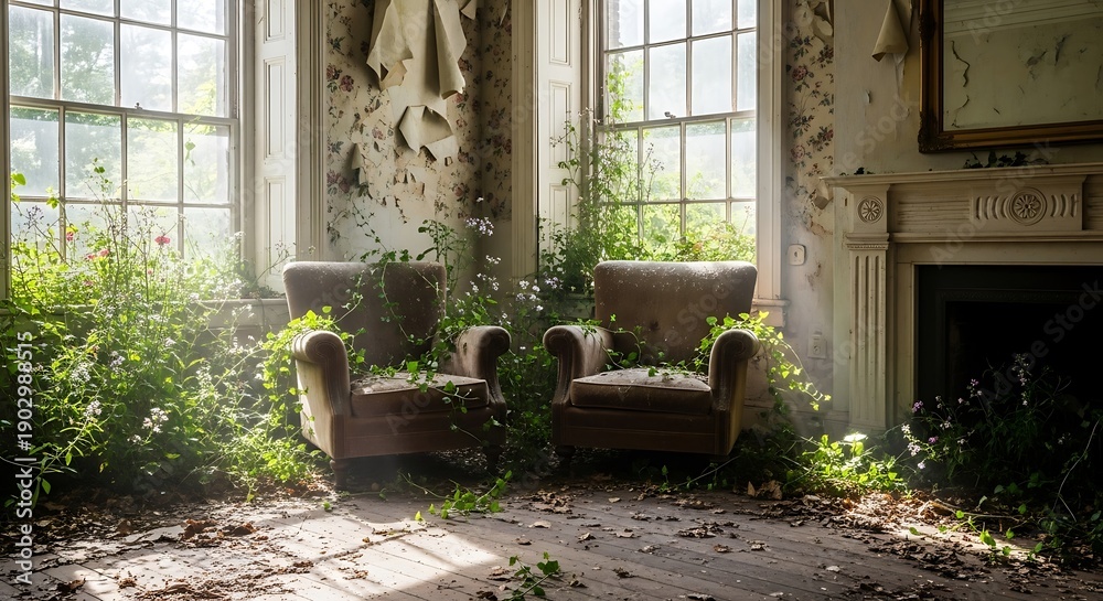 Abandoned room with overgrown plants and sunlight. #1902988515
