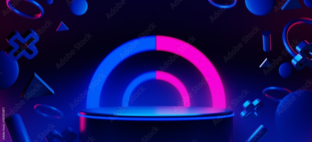 abstract backgound video game of scifi gaming cyberpunk, vr virtual reality simulation and metaverse, scene stand pedestal stage, 3d illustration rendering, futuristic neon glow room #1929131871