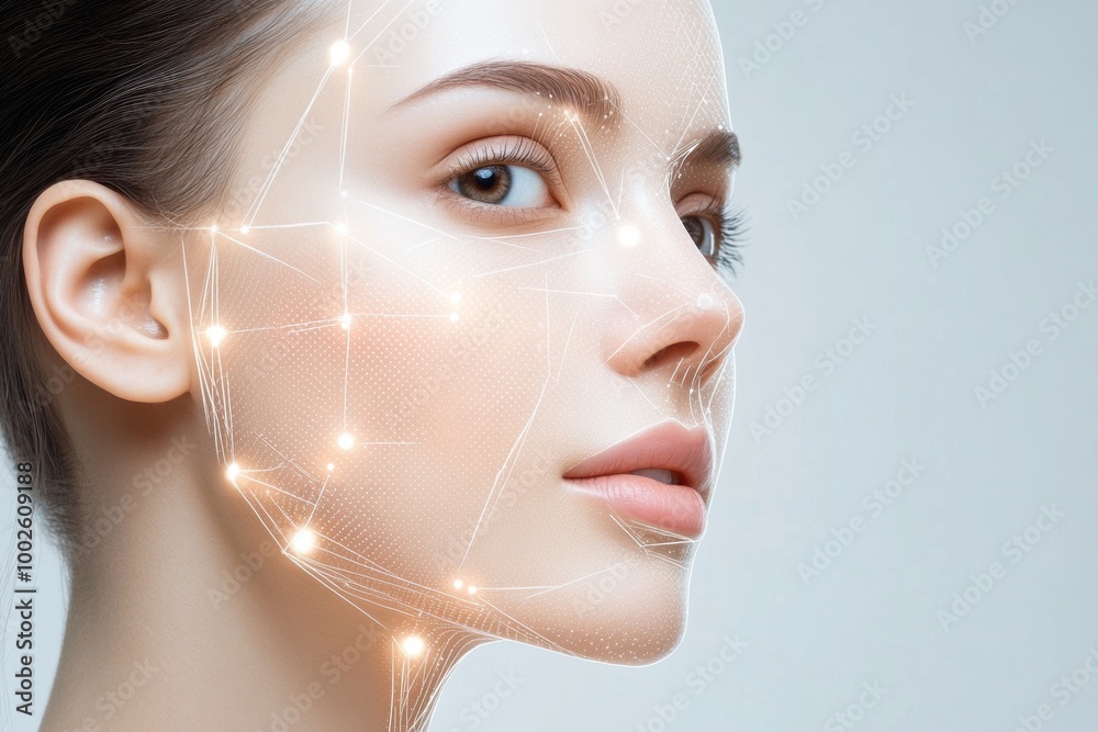 Abstract background depicting key elements of skincare procedures with lines and dots illustrating facial treatment techniques. Generative AI #1002609188