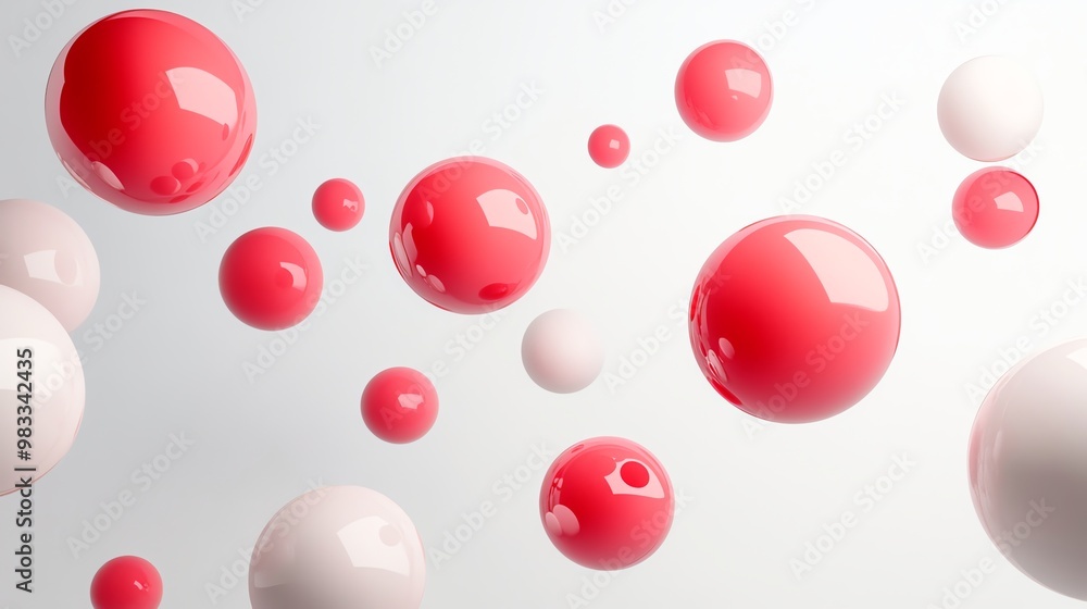 Abstract background of red and white glossy spheres floating in the air. #983342435
