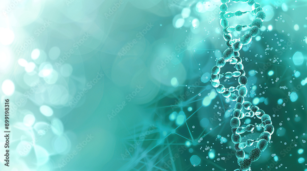 Abstract background with double helix of DNA and biembaliacryl bubbles on blue green background #899198316