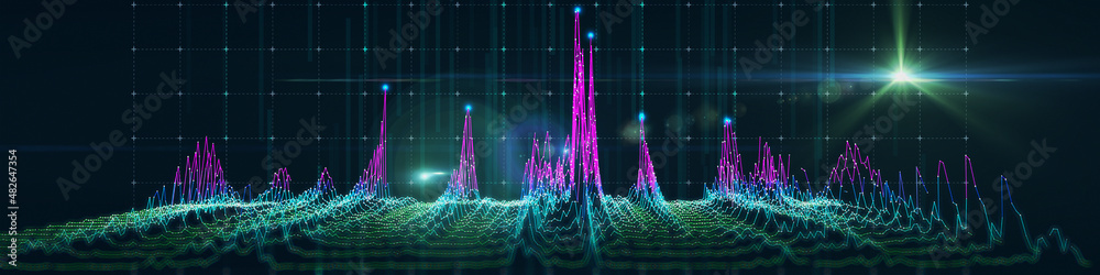 Abstract background with polygonal noisy algorithm grid connecting dots on dark. Big Data. Analytics data algorithms. Computing concept. Banner horizontal for business, science and technology. #482647354
