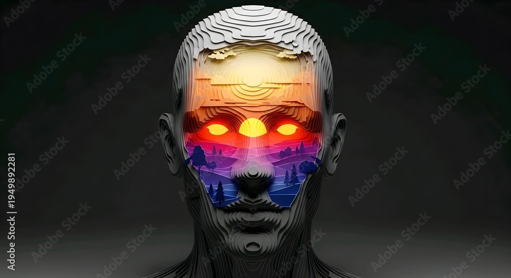 Abstract digital visualization of a human form crafted from modular blocks, revealing a vivid inner landscape with glowing eyes, symbolizing profound thought, consciousness, and internal perception #1949892281