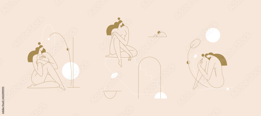 Abstract female body silhouette vector illustration set. Contemporary nude woman figure, feminine design with geometric shapes, boho colored. Beauty, body care concept collection for logo. Modern art #632092155