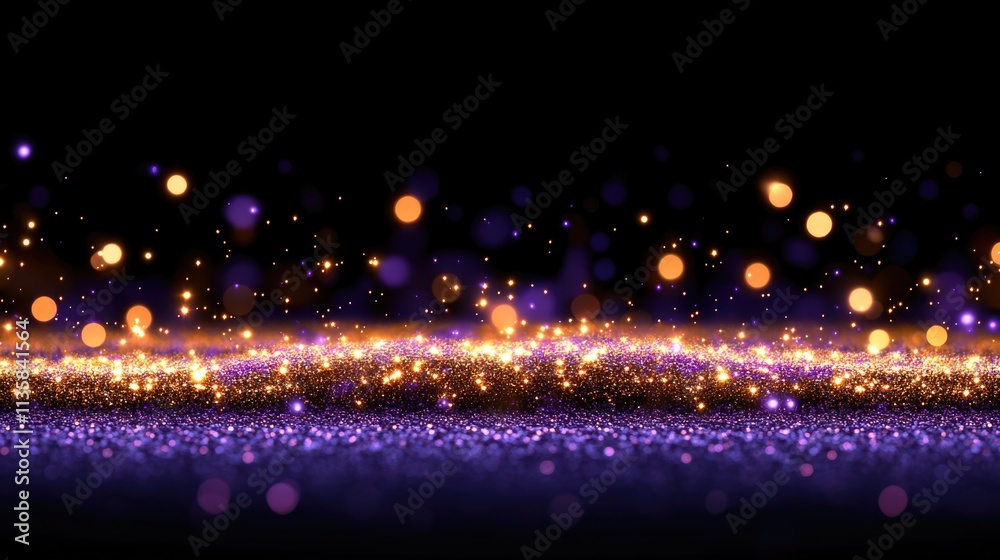 Abstract glowing purple and gold bokeh lights on dark background. Merry Christmas. Happy New Year. #1135841564