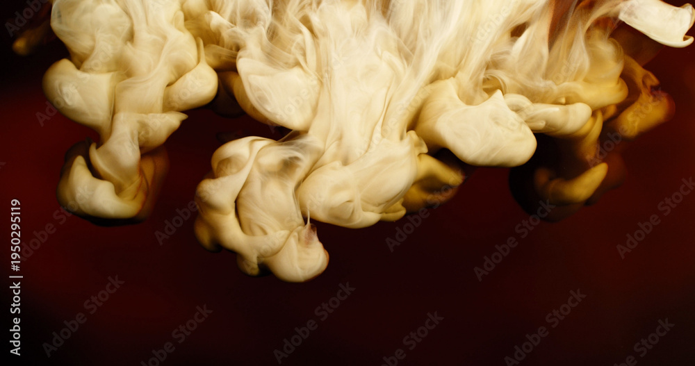 Abstract macro of milk mixing with coffee creating flowing creamy patterns and fluid shapes. Swirling liquid forms soft textures and organic motion, forming a dramatic beverage background. #1950295119
