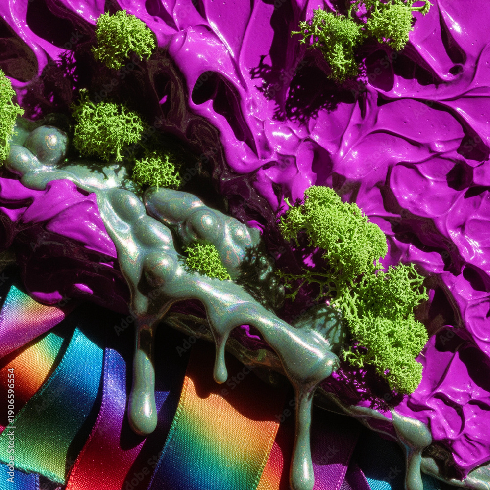 Abstract Mixed Media Artwork Featuring Thick Textured Purple Paint, Green Moss Accents, and Metallic Silver Drips with a Rainbow Ribbon Detail #1906596554