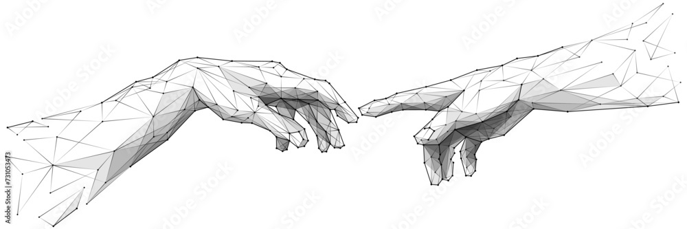 Abstract polygonal Adam and God hands reaching out for touch. Creation concept. Brutalism polygonal art isolated on white. Minimalistic technology background. Vector illustration. Connected dots. #731053473
