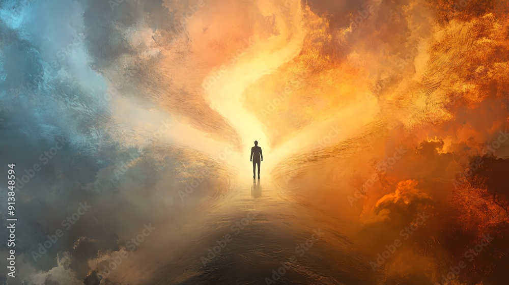 Abstract scene of a figure facing two diverging paths, each lined with symbolic elements of moral dilemmas and ethical choices #913848594