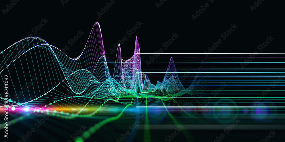 Abstract technology background with color wireframe graph on black. Visual presentation of analytics lines algorithms. Computing concept. Banner for business, science and technology. Big Data. #498714042