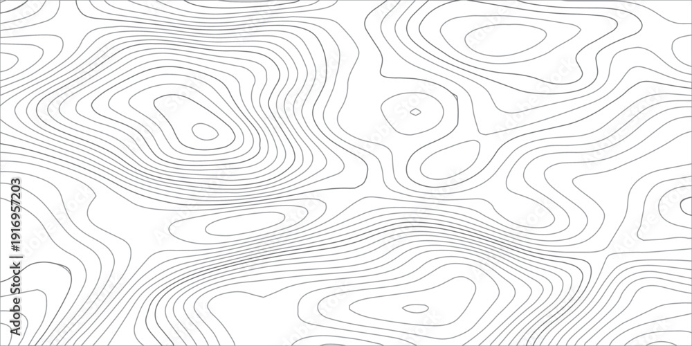 Abstract terrain elevation map with black contour lines and soft gray flowing curves, representing geographic landscape and mountain cartography in a clean minimalist style. #1916957203