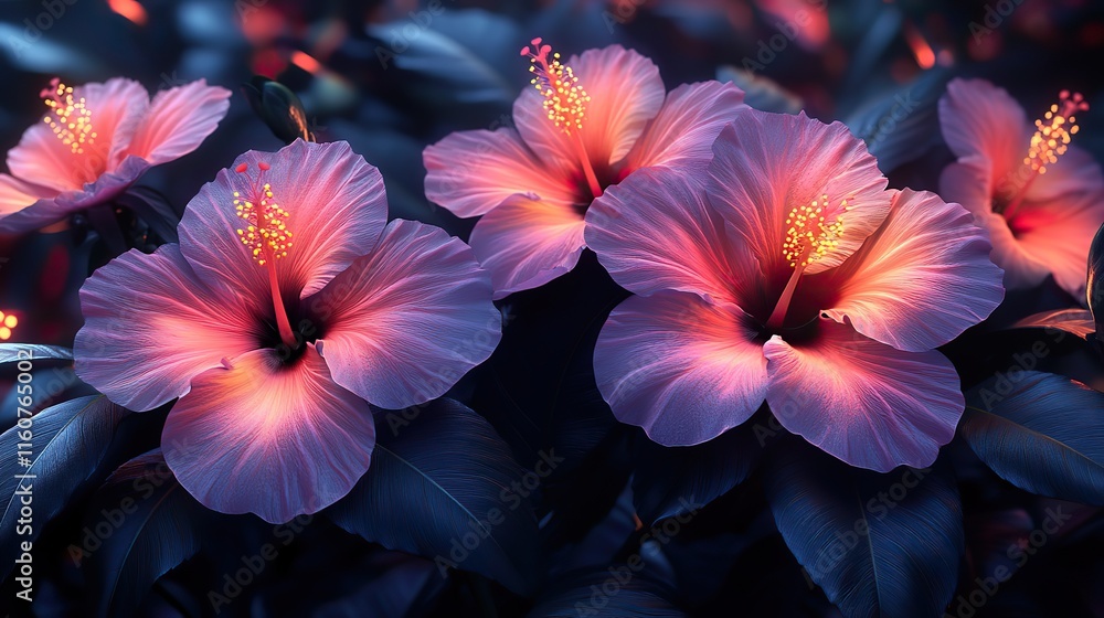 Abstract tropical flowers create a bright wallpaper with cyberpunk digital art. This futuristic design features hibiscus and floral arrangements on a dark background with vibrant colors #1160765002