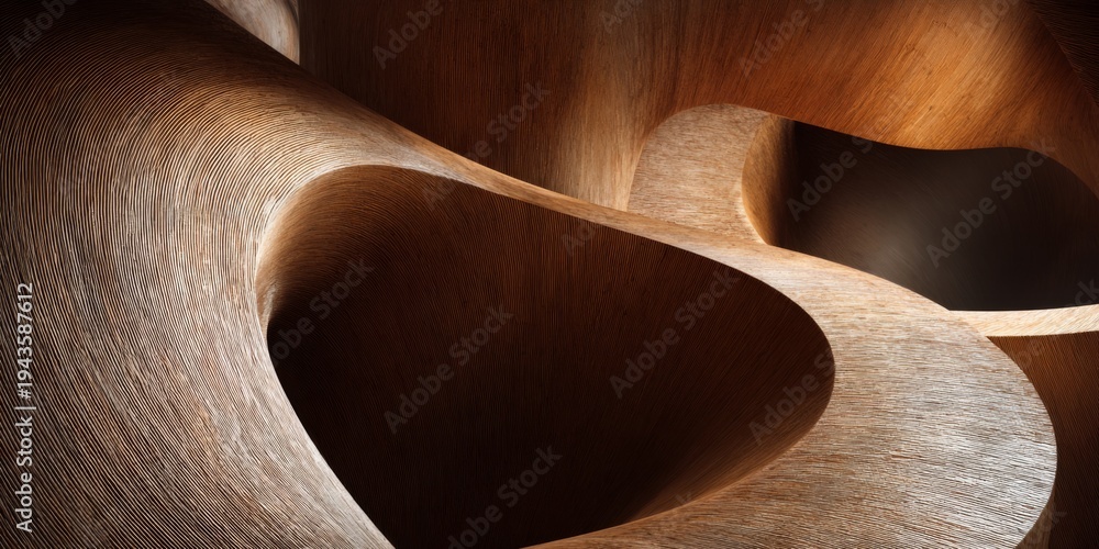 Abstract wood design with flowing curves and dynamic patterns showcasing warm tones and intricate textures in an artistic composition #1943587612