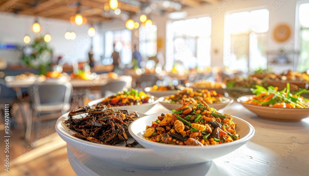 Abundant buffet spread of colorful, nutrient-dense dishes served at a vibrant restaurant during a meal #1940701111
