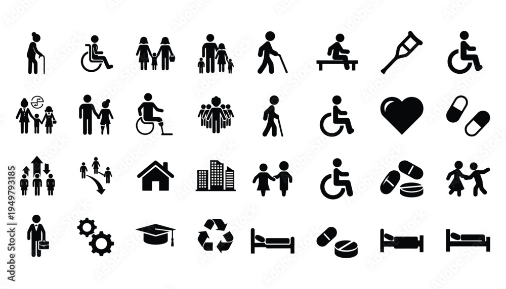 Accessibility and healthcare icons depicting diverse people and medical facilities #1949793185