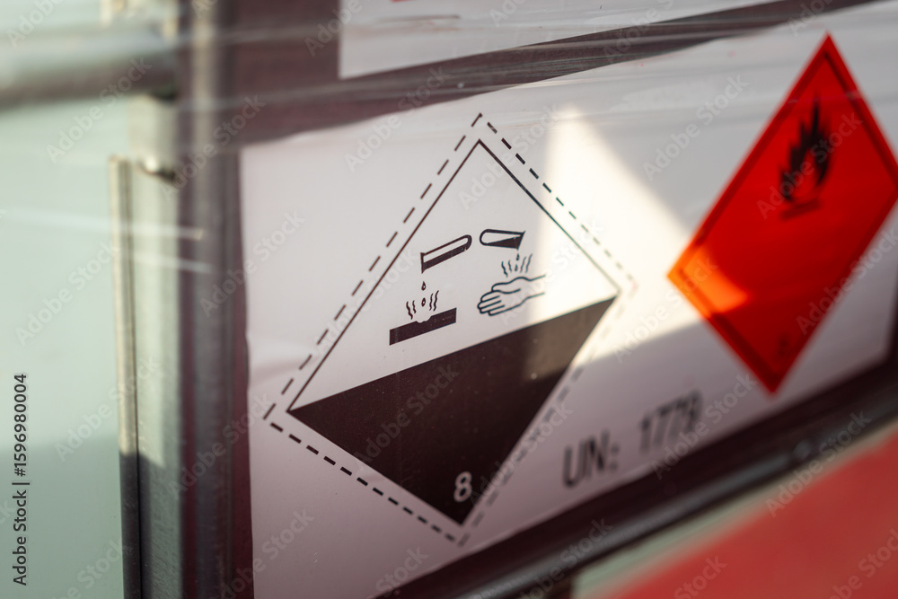 Acidity corrosion or skin burn hazard, safety sign on the chemical containment barrel. Sign and symbol for industrial product, close-up. #1596980004